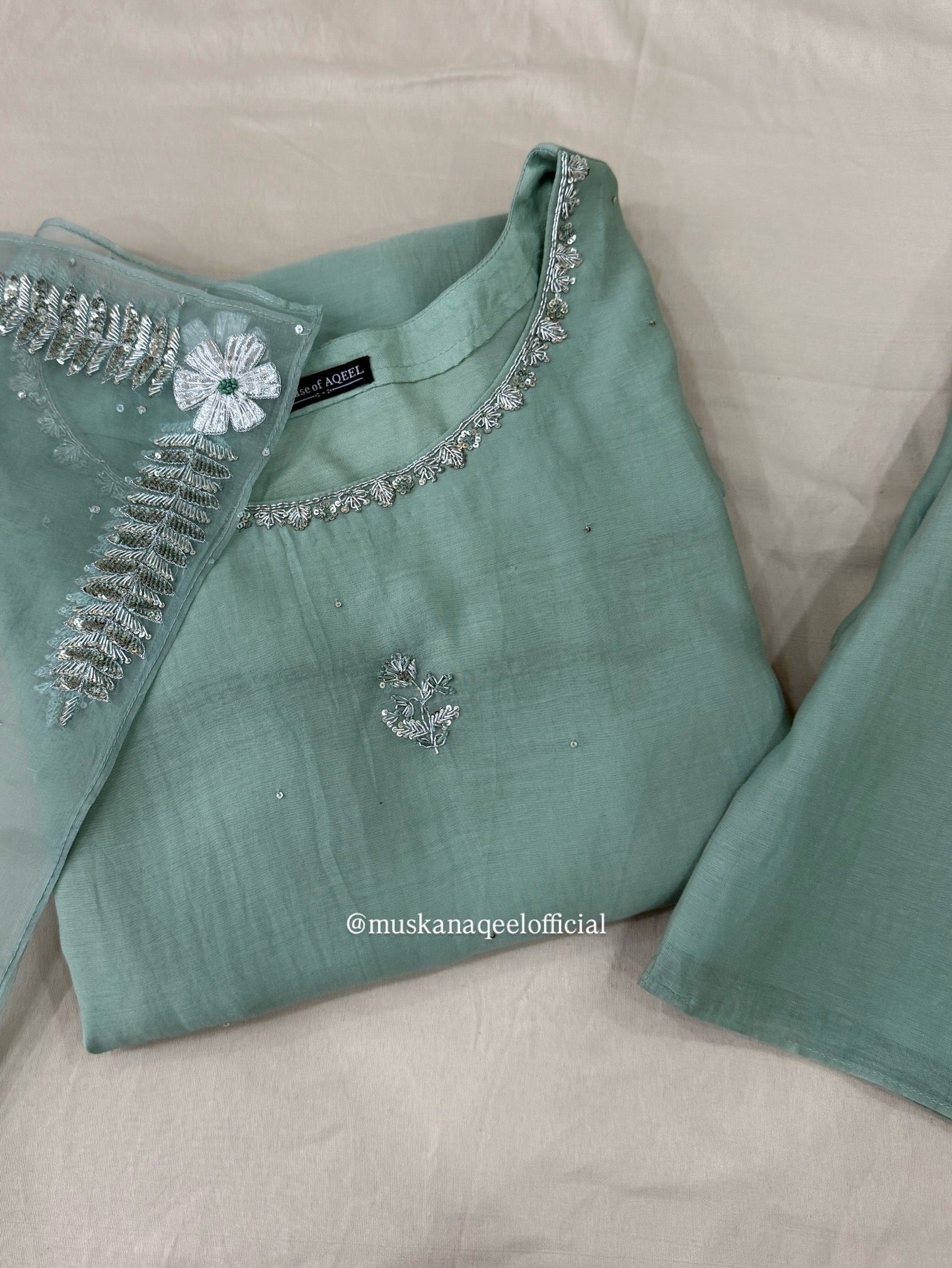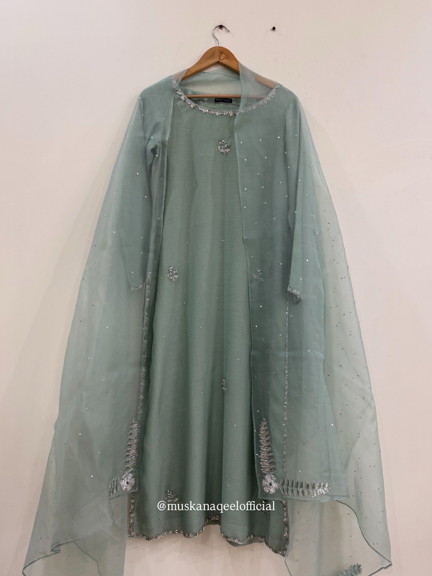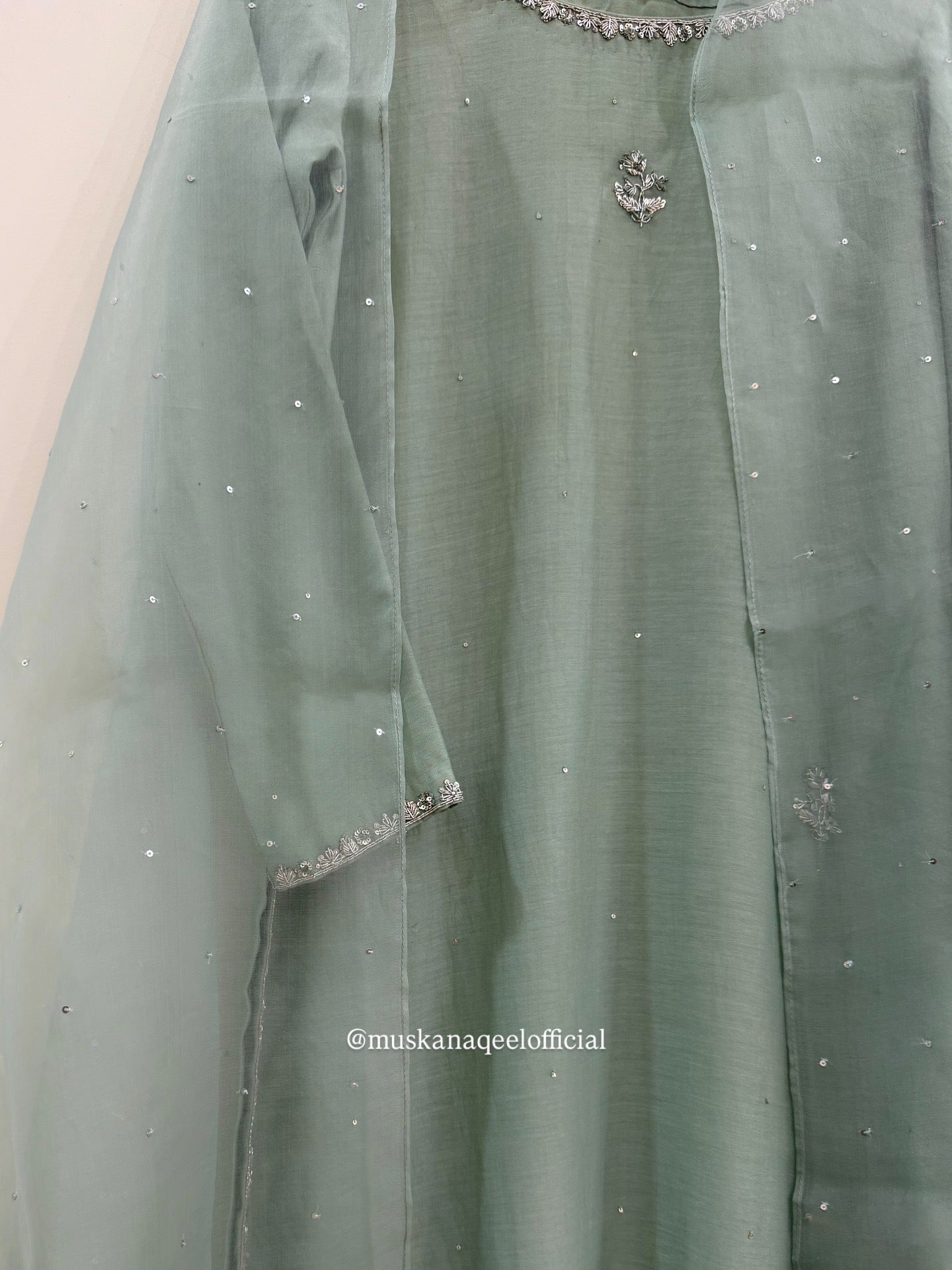 A soft sea-green base kurta with a clean, straight silhouette and delicate silver embellished borders. The dupatta is finished with fine gota patti floral detailing along with tiny embellishments all over. Paired with a palazzo bottom.